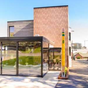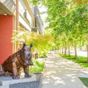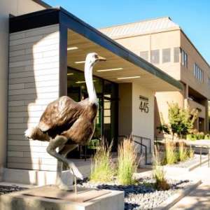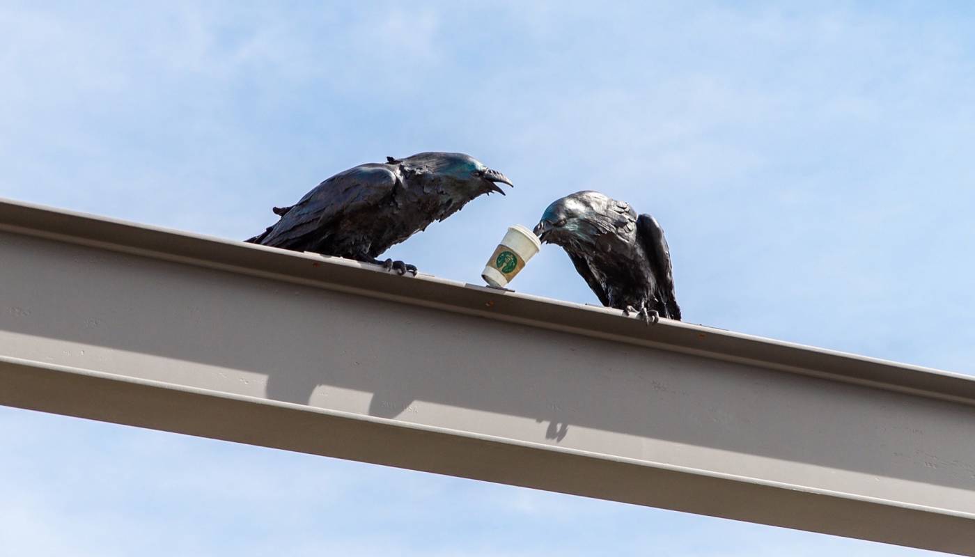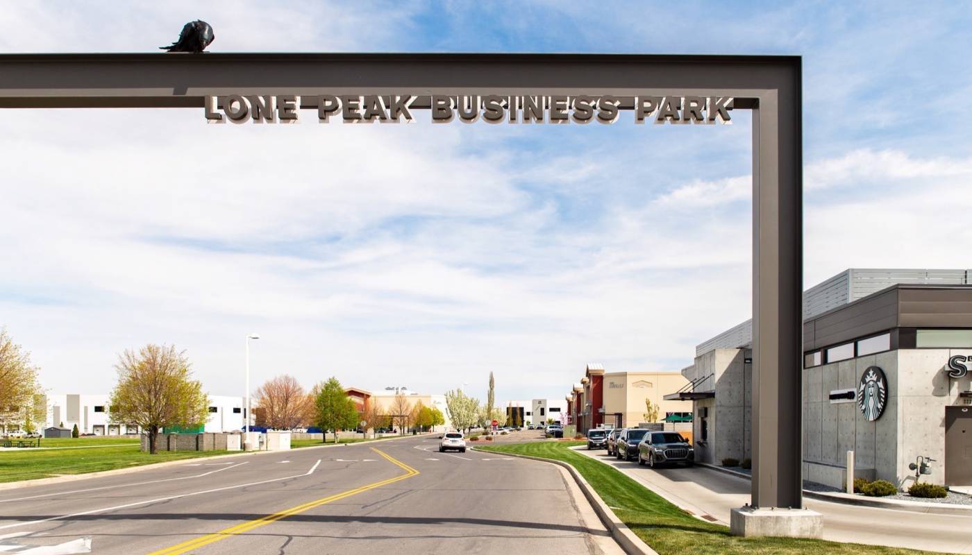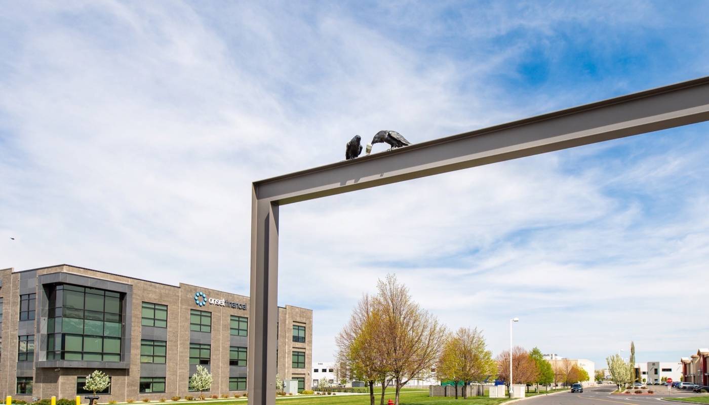Partnering with Utah-based foundry Adonis Bronze, Utah artist Michael Wilson designed and sculpted three 200-pound Cravens that sit atop a 22-foot tail feature entry leading to the Price Lone Peak Business Park. A playful detail is a Starbucks cup held in the beak of one of the birds, which is fitting singe the entry stands next to a Starbucks.
